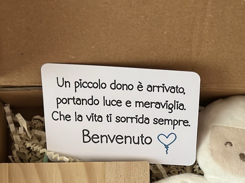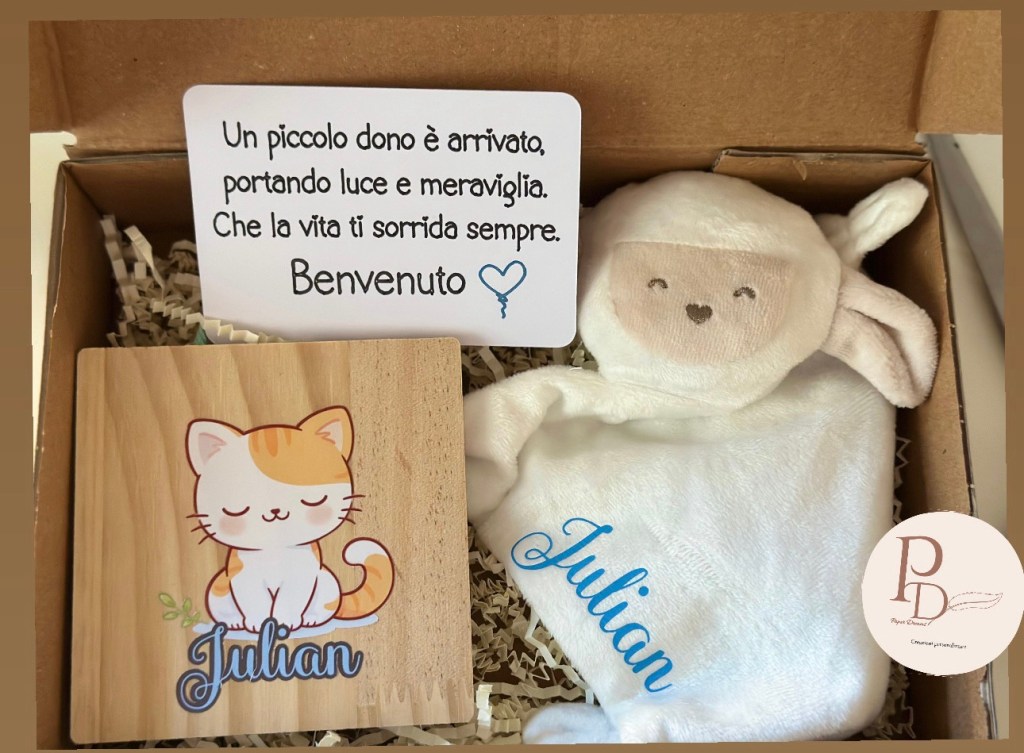All’interno troverai un tenero doudou morbido, un piccolo quadretto personalizzato con il nome e una dedica speciale.
