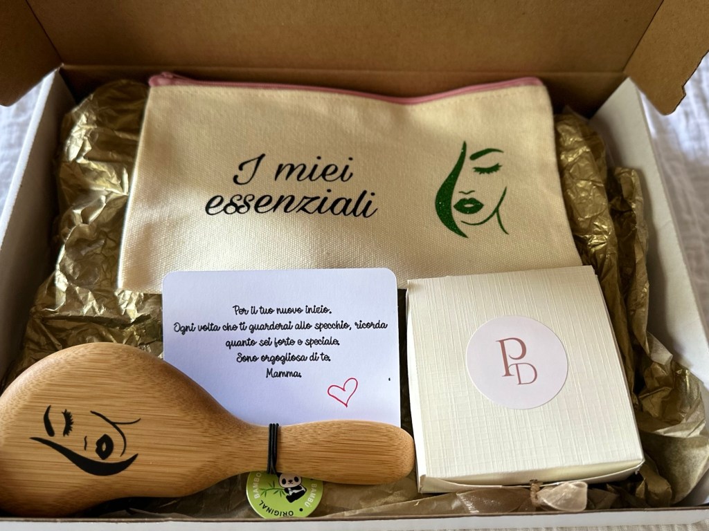 Una box regalo con accessori beauty personalizzati.